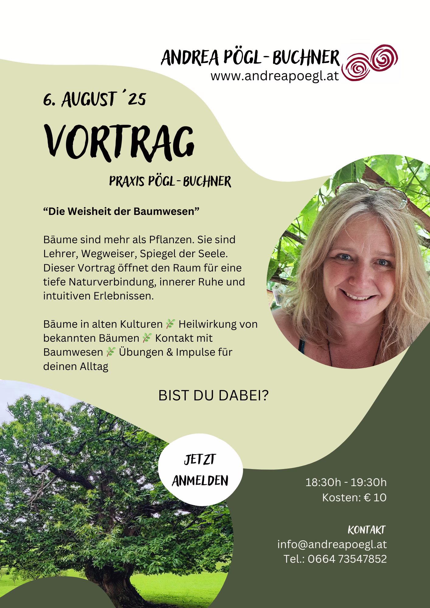 Quelle zur Mitte Zentrum für Körper, Geist und Seele Breitegasse 12, 2540 Bad Vöslau"Die Weisheit der Baumwesen" Bäume sind mehr als Pflanzen. Sie sind Lehrer, Wegweiser, Spiegel der Seele. Dieser Vortrag öffnet den Raum für eine tiefe Naturverbindung, innerer Ruhe und intuitiven Erlebnissen.… Weiterlesen »Vortrag: „Die Weisheit der Baumwesen“ – Quelle zur Mitte/Bad Vöslau